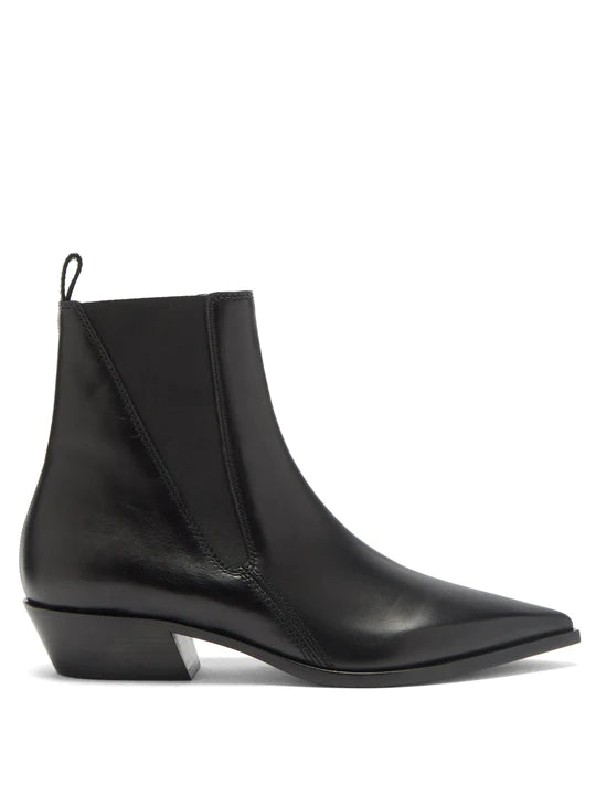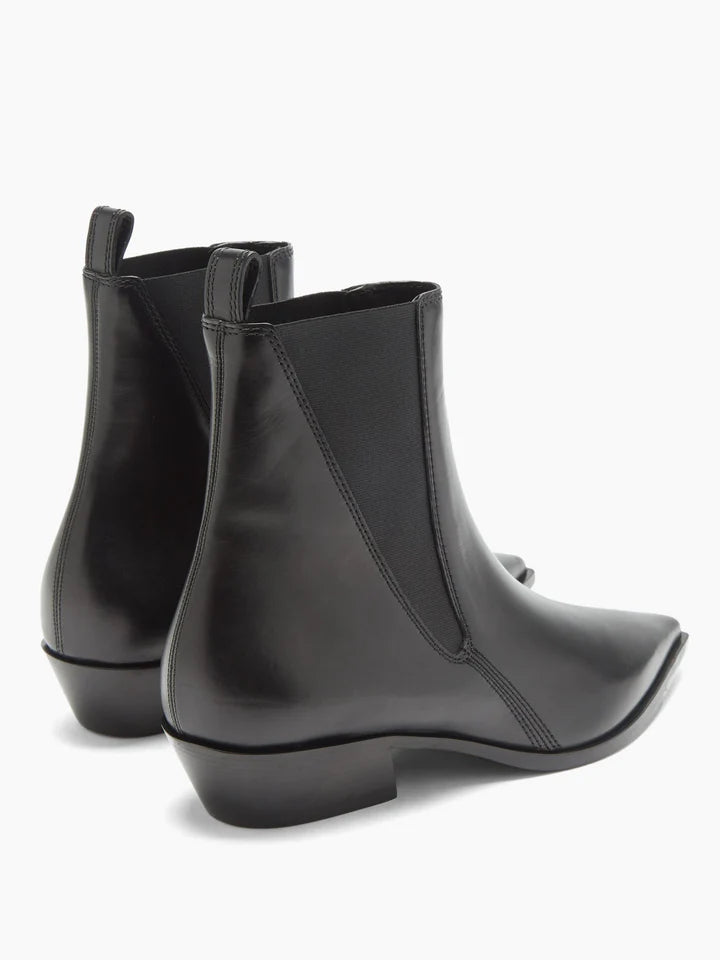 Clean, defined lines bring a confident look to Burberry's black Grampian Chelsea boots. They're crafted from smooth leather with sharply pointed toes and angular elasticated side panels, then set on a low stacked heel. Wear them under fluted tailoring for an androgynous look.
